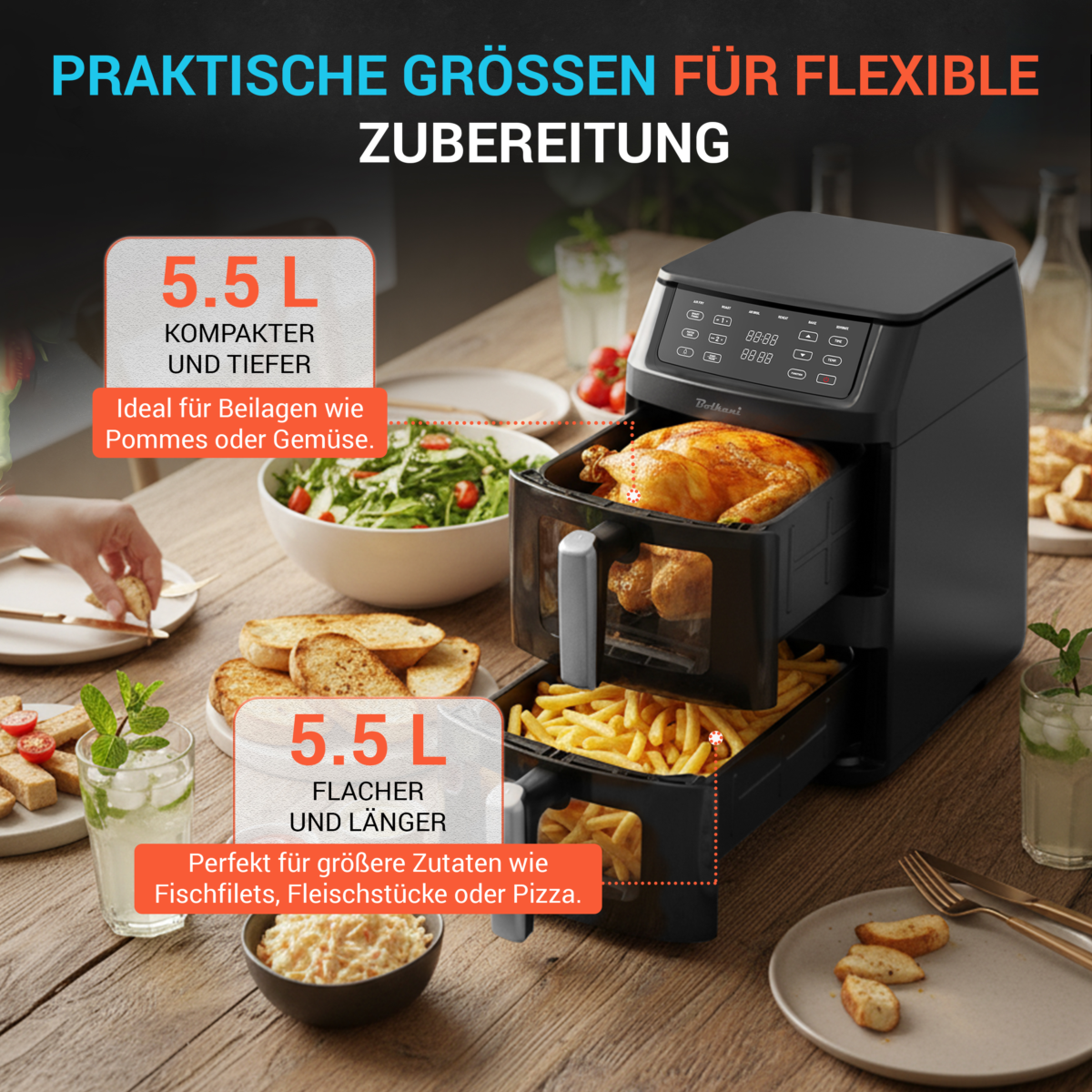 - Double Stack & Dual Zone: Two independent 5.5 L chambers (11 L total) with viewing window and interior lighting for maximum flexibility when cooking.