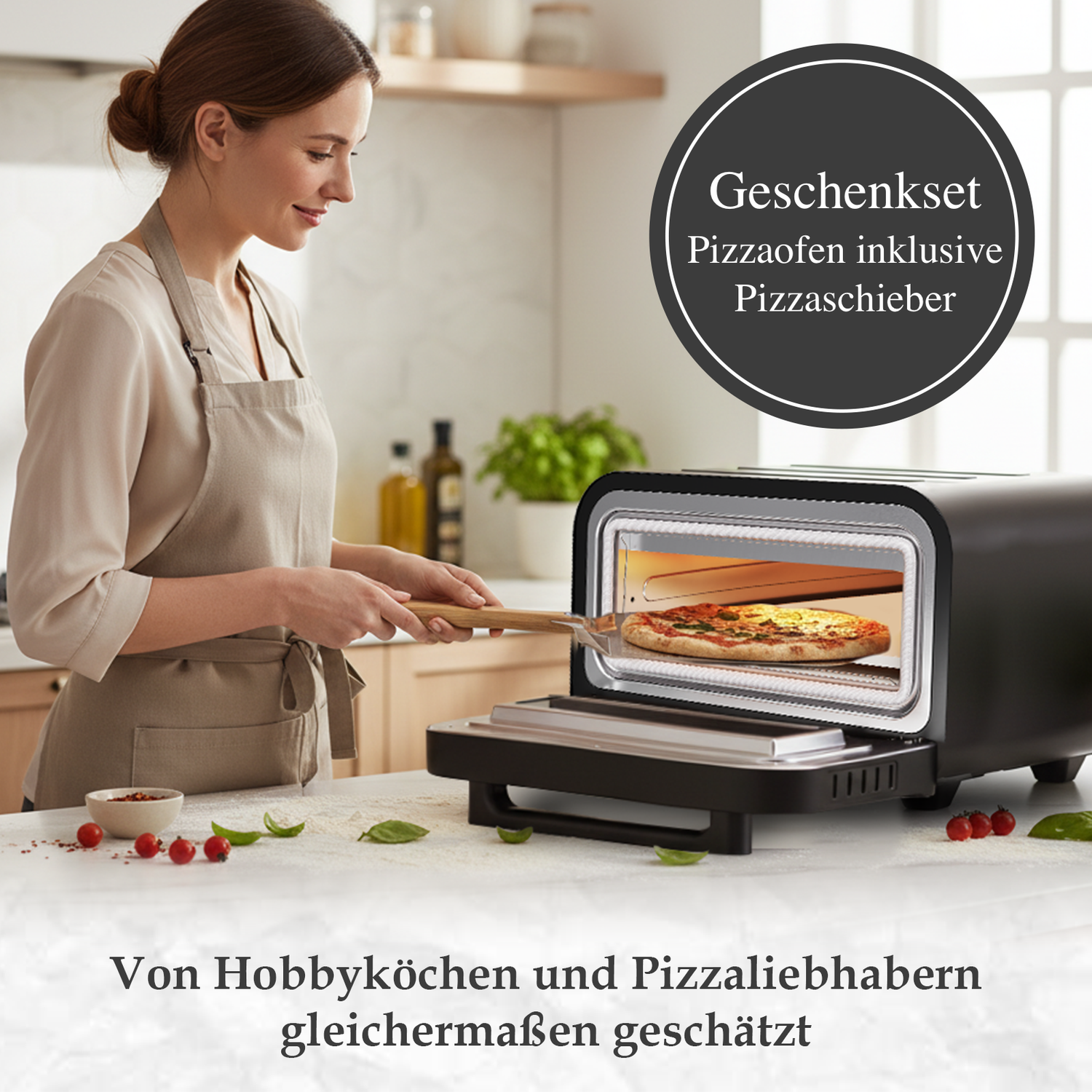 • Energy-efficient & powerful: The heat-insulated stainless steel housing saves energy with a consumption of only 1 kWh/h. Ideal as a compact tabletop pizza oven for indoor use.