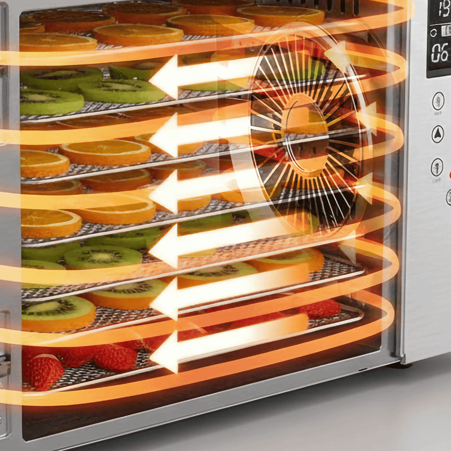 • Gleichmäßige Trocknung: Der horizontale Luftstrom garantiert gleichmäßige Ergebnisse auf allen Ebenen. Ideal zum Dörren von Obst, Gemüse, Fleisch, Kräutern oder Haustiersnacks.