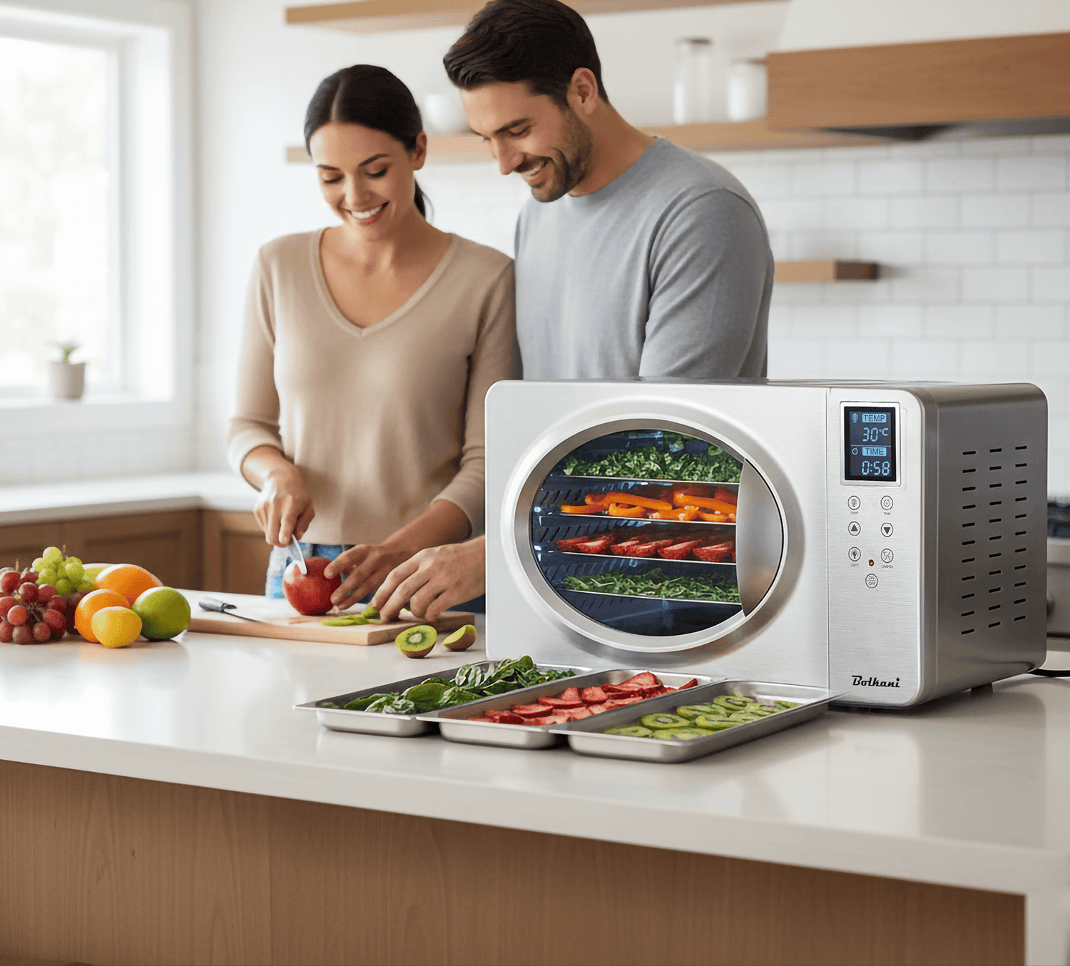 Der Bolkani Dörrautomat überzeugt durch sein modernes Design, seine kompakte Bauweise und seinen leisen Betrieb und eignet sich damit perfekt für jede Küche. Mit mehreren Edelstahl-Etagen, präziser Temperatursteuerung und gleichmäßiger Luftzirkulation.